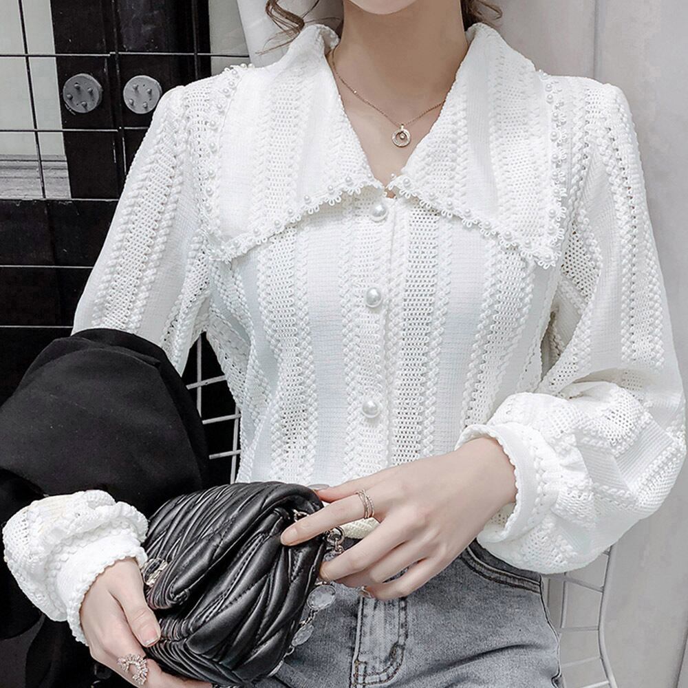 レディース 韓国おしゃれ Vネック デカ襟トップス 長袖シャツ レースブラウス 白黒オフィスカジュアル パフスリーブ春服
