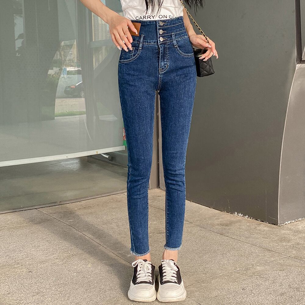 ハイウエスト 3連ボタン スキニーパンツ 細見え ジーパン きれいめ ロングパンツ 着やせ 韓国風 ボトムス 美脚脚長