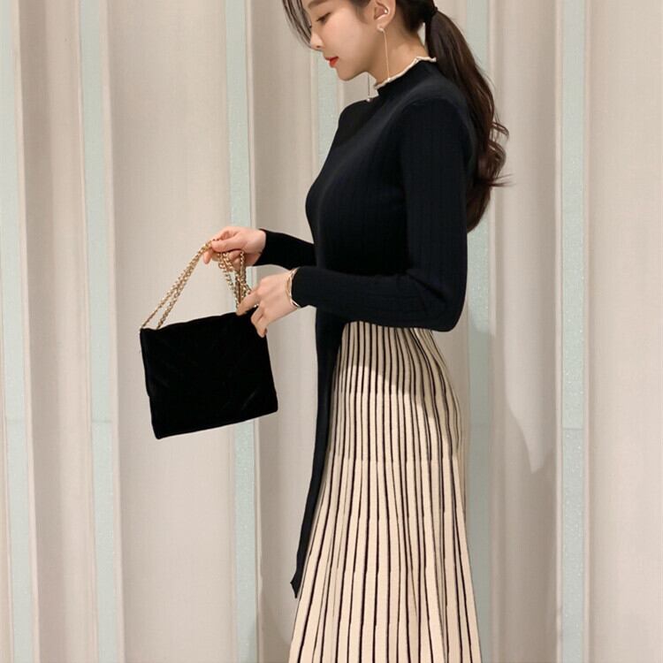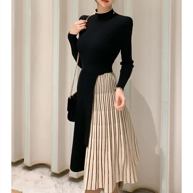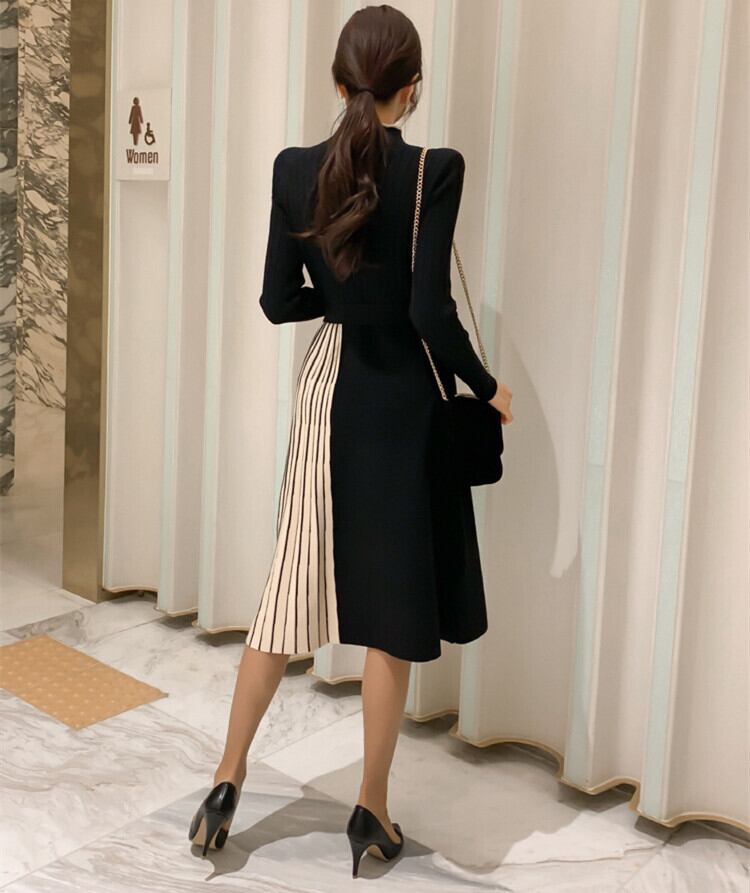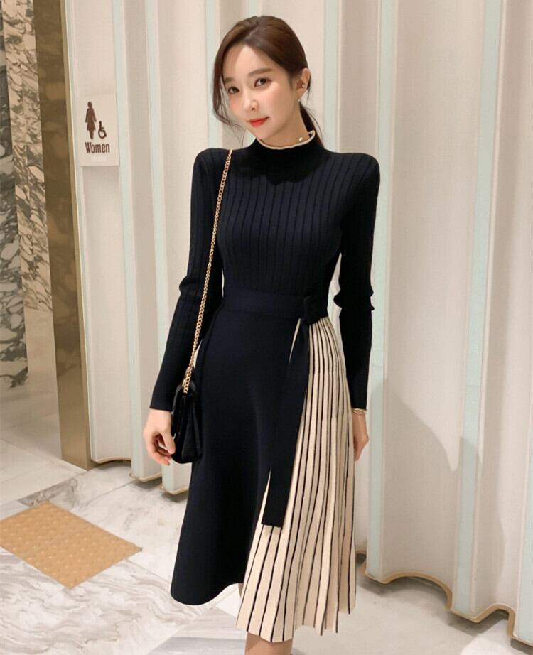 ワンピース ニットワンピース スリット プリーツ切り替え フリーサイズブラックのみ