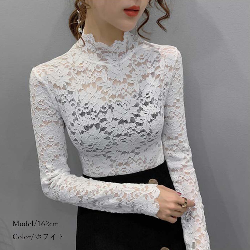 総レース カットソー レディース 花柄 シースルー ハイネック 長袖 トップス ワンサイズのみ