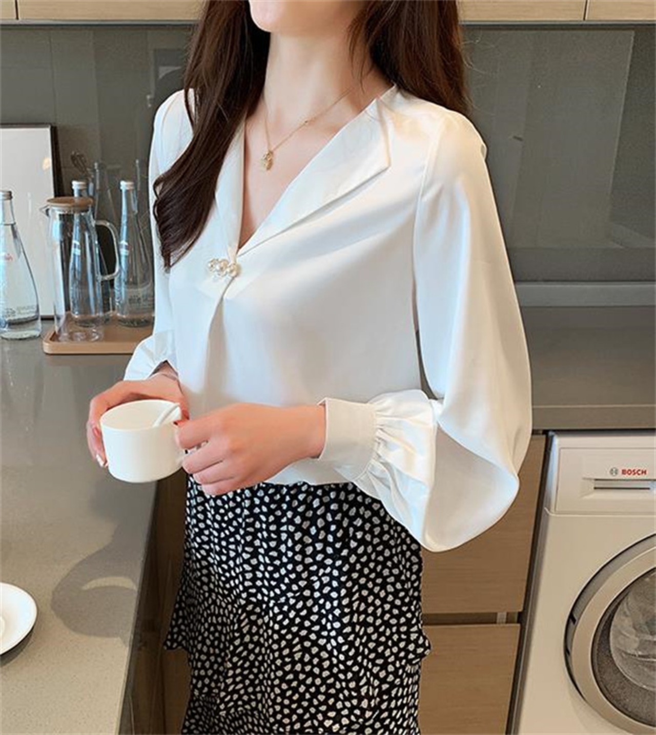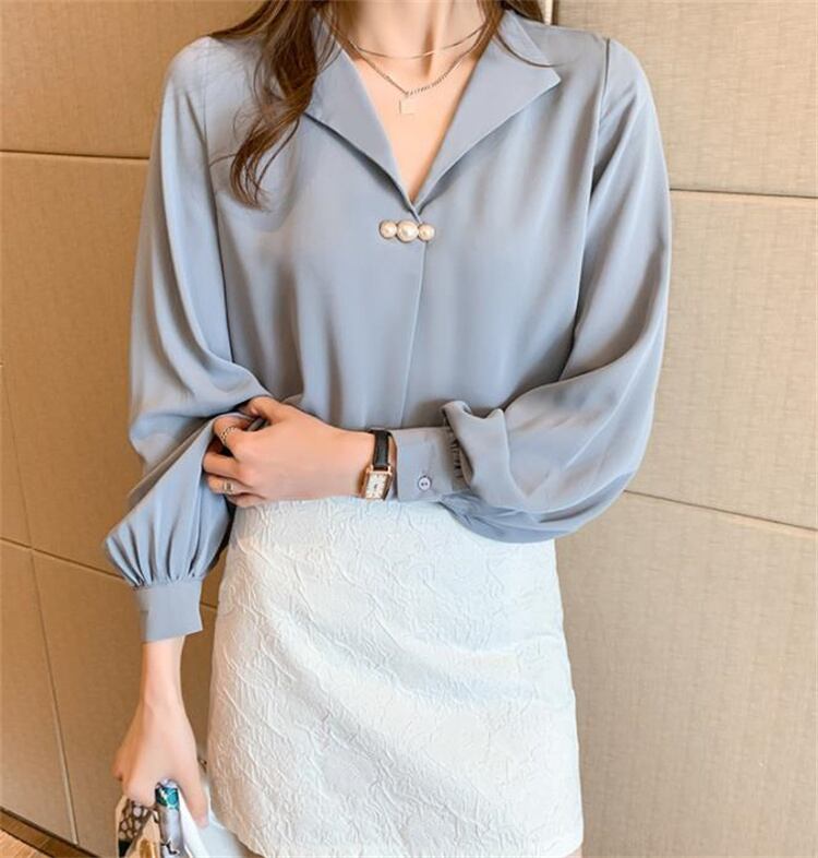 細見えするシャツ 快適 春秋 シフォンブラウス 気質 ゆったり 薄手 Vネック 長袖