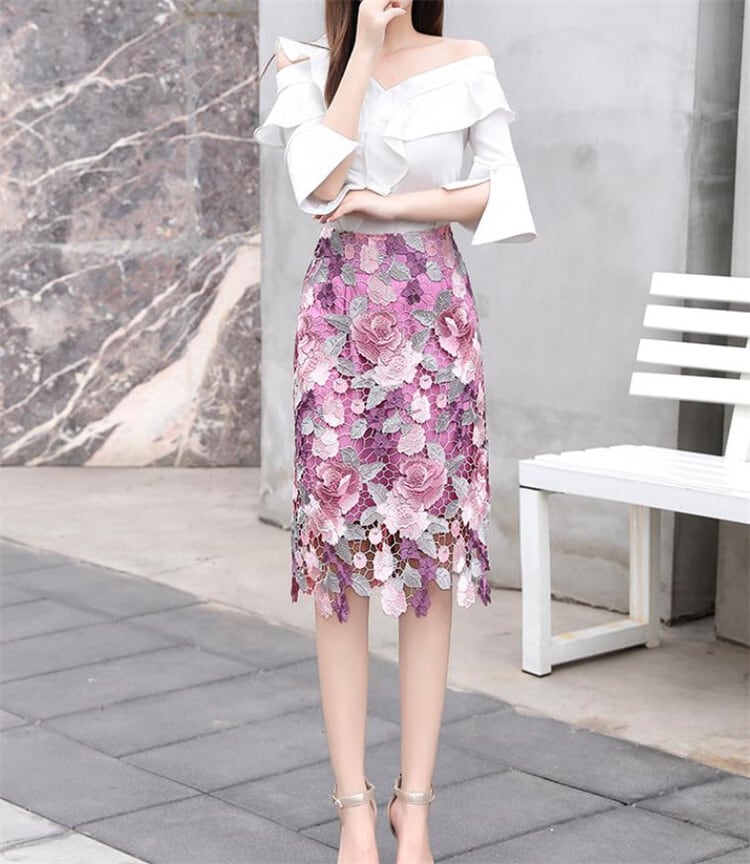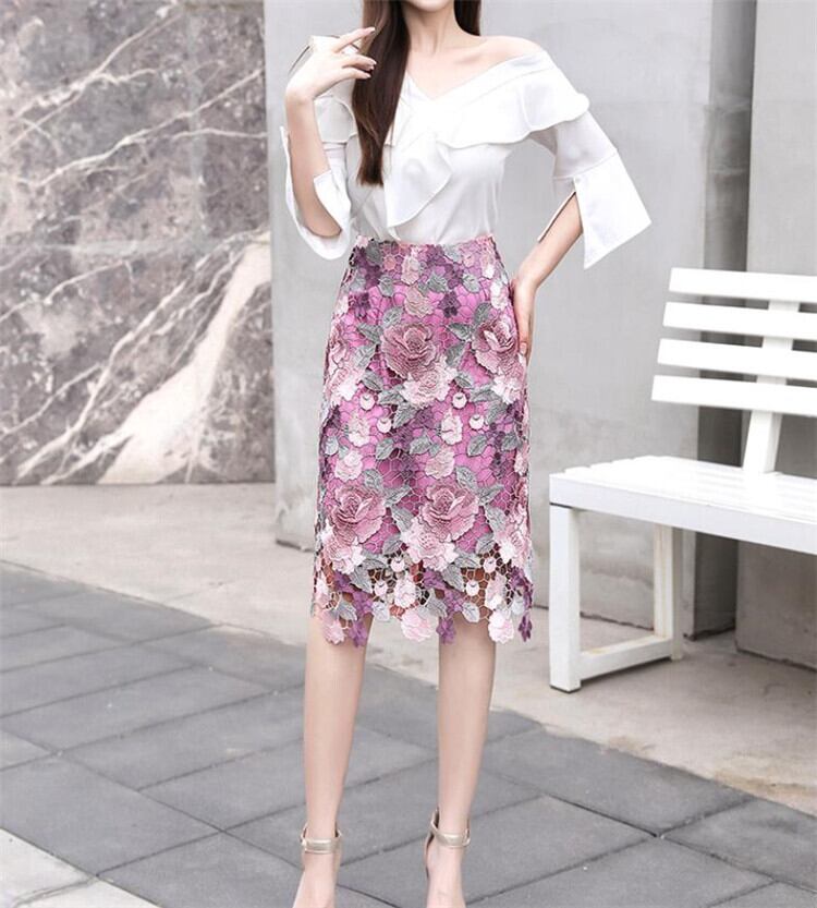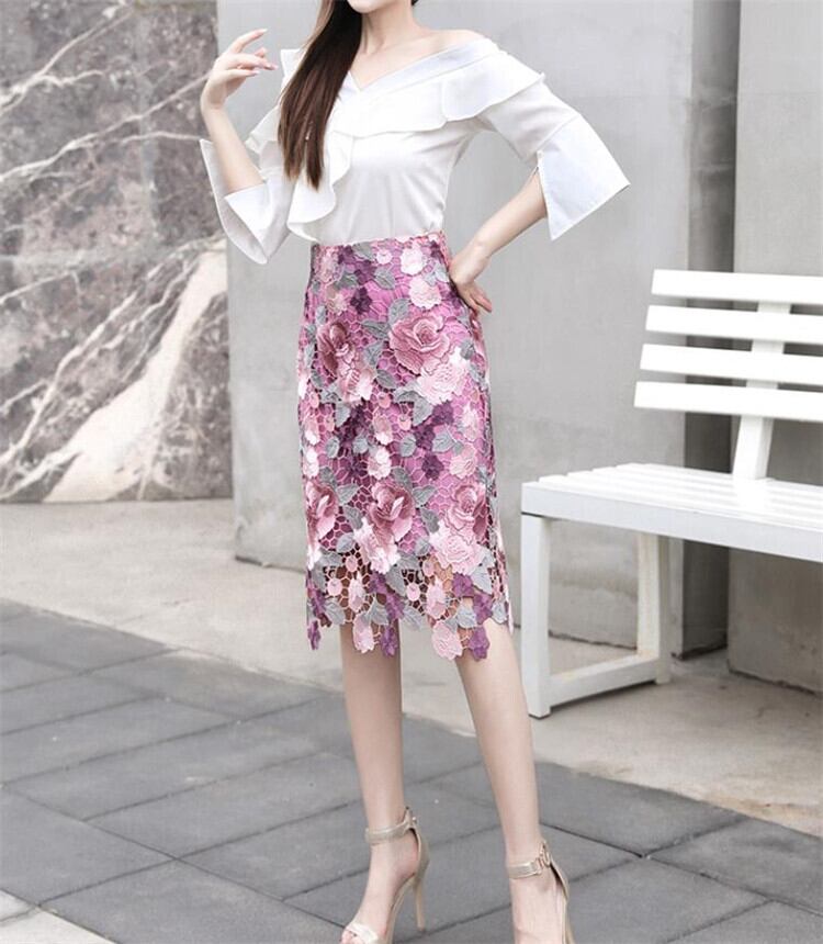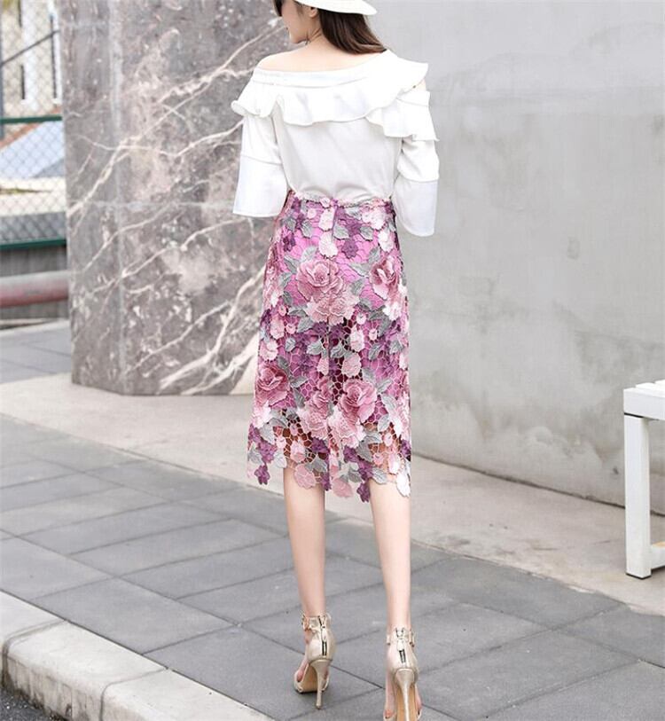 透かし彫り レディース スリム ミドルスカート パターン スカート ハイウエスト レーススカート
